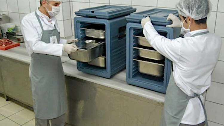 Üretilen yemekler, sıcaklığını ve lezzetini koruyan izole edilmiş termobox kaplarda, yemek taşımaya uygun servis araçlarıyla firmalara ulaştırılır.